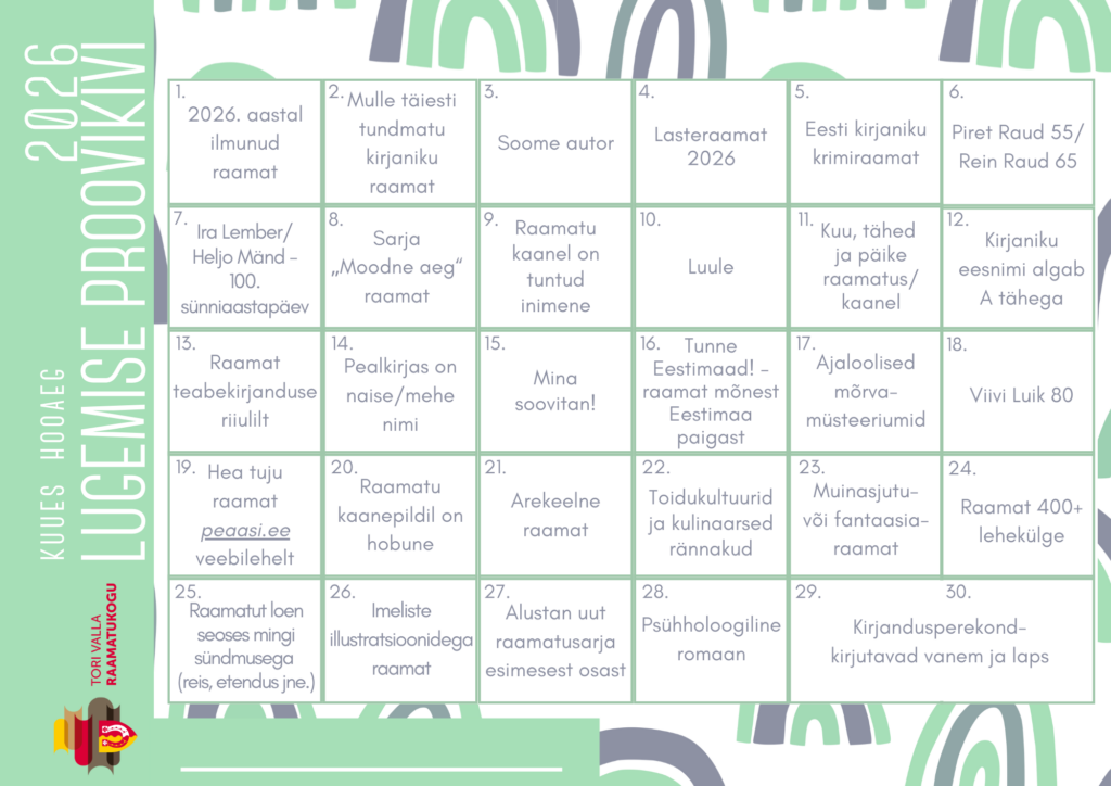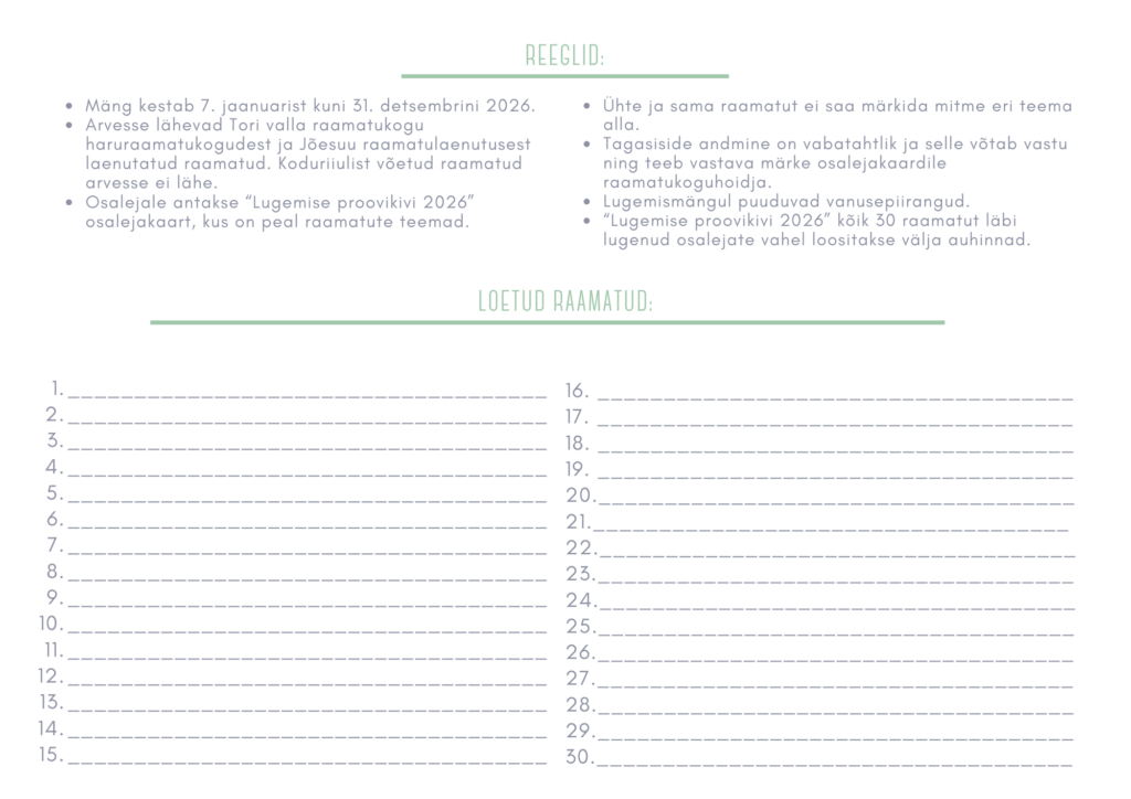 • “Lugemise proovikivi 2026” kõik 30 raamatut läbi lugenud osalejate vahel loositakse välja auhinnad.